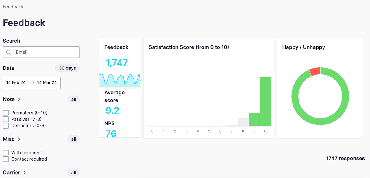 Average score: This is the overall average score out of 10 given by customers over the selected period. It is possible that a customer may have clicked on the dissatisfied icon, but still have left a relatively high score.