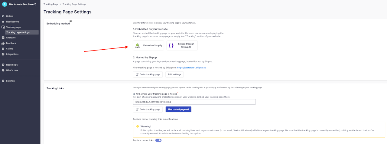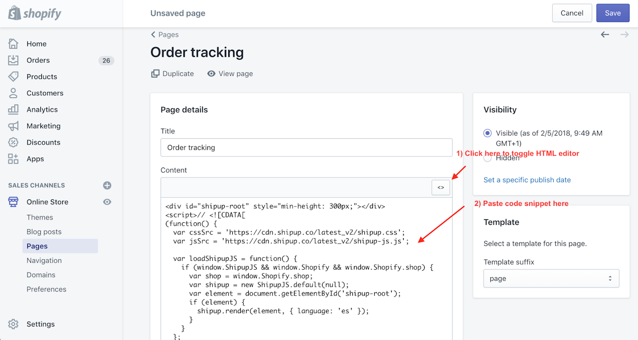 <>(Show HTML) and copy and paste the snippet shown below.Check that the tracking page is working properly. You can now contact the Shipup team to ask them to remove ShipupJS from other pages on your site. You can contact us via the contact form below or at support@shipup.co.