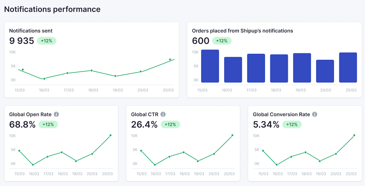 Notifications delivered: Total email notifications delivered by Shipup (excluding notifications sent to your customer support team).