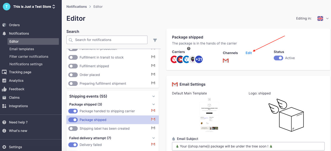 In the "Editor" tab of "Notifications", click on "Edit" next to "Channels" (see image on left).