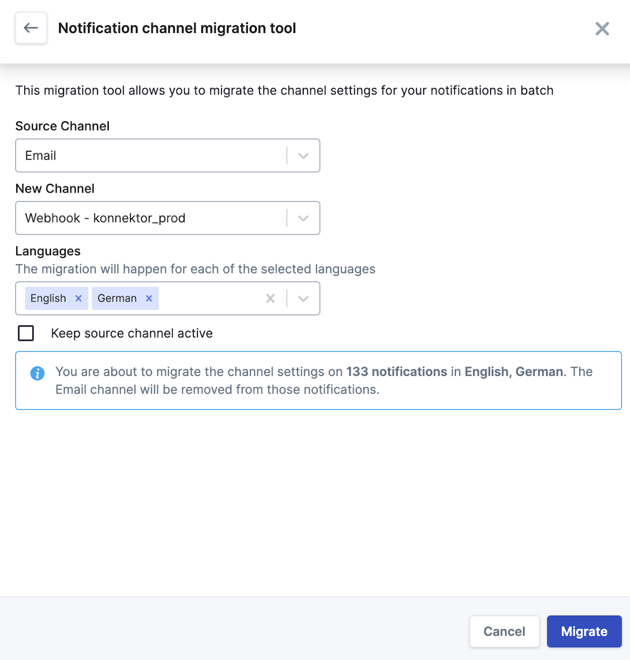 Languages: If you send notifications in several languages, you can decide which languages you want to migrate. Migration will iterate language by language. For each language selected, it will find the source notification and activate the new channel.