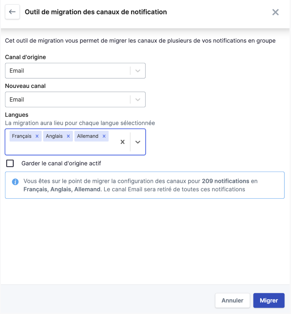 Langues : Si vous envoyez des notifications en plusieurs langues, vous pouvez décider des langues pour lesquelles vous souhaitez effectuer la migration. La migration va itérer langue par langue. Pour chaque langue sélectionnée, elle trouvera la notification source et activera le nouveau canal.