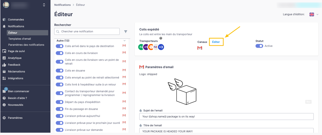 Dans l'onglet "Éditeur" (Notifications), en cliquant sur "Éditer" au niveau de "Canaux (voir l'image de gauche).