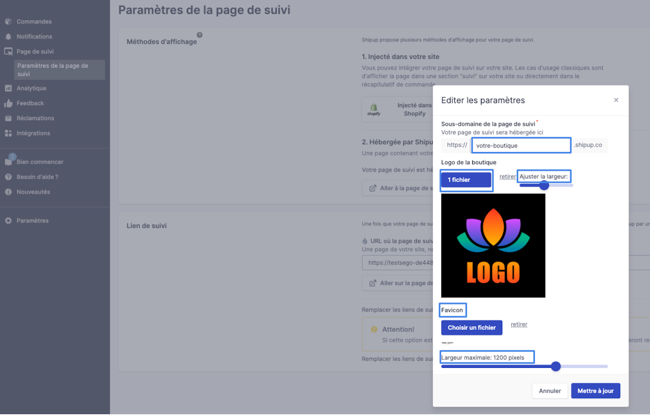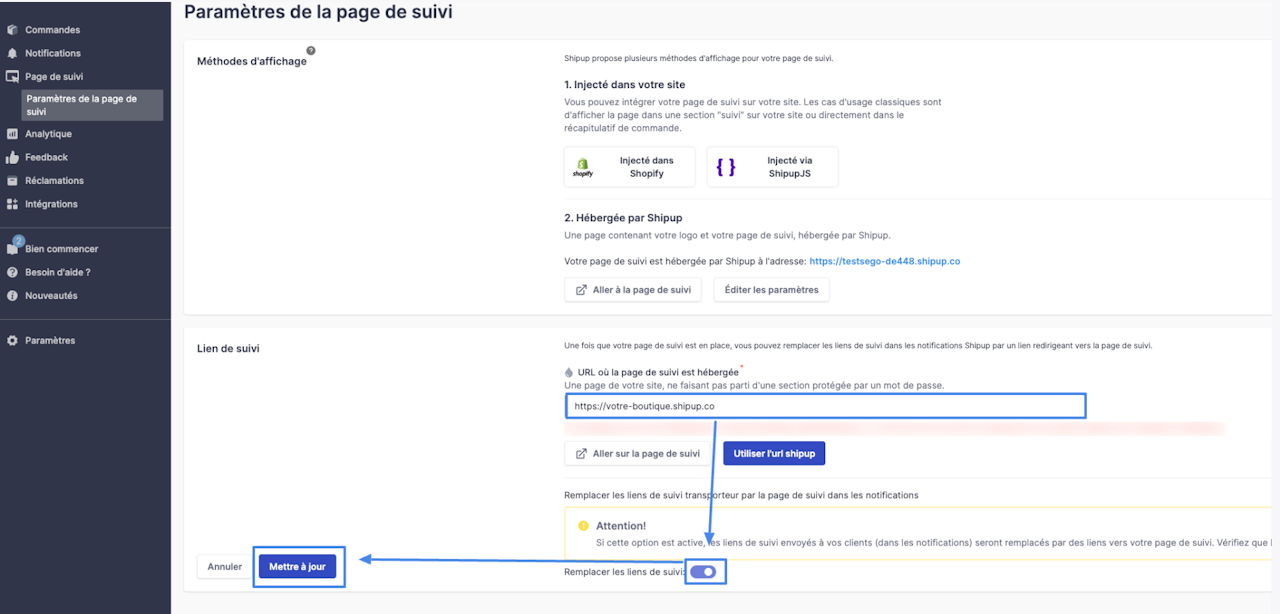 La page de suivi hébergée par Shipup est déjà créée et prête à être activée.